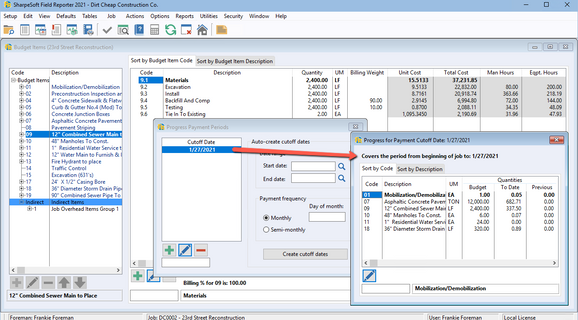 Once you have won the bid using Estimator, your estimate can be transferred in the form of a budget to Field Reporter, including the amounts of labor, material, equipment, subcontractor, plugs, and other estimated costs for each sub-item.